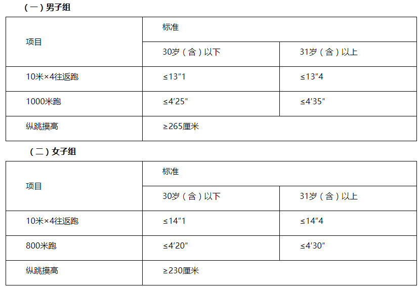 體能測評(píng)三項(xiàng)全部達(dá)標(biāo)方為合格。體能測評(píng)項(xiàng)目中,縱跳摸高的測試次數(shù)不超過3次,10米×4往返跑的測試次數(shù)不超過2次,長跑項(xiàng)目(男子1000米、女子800米)的測試次數(shù)為1次。
