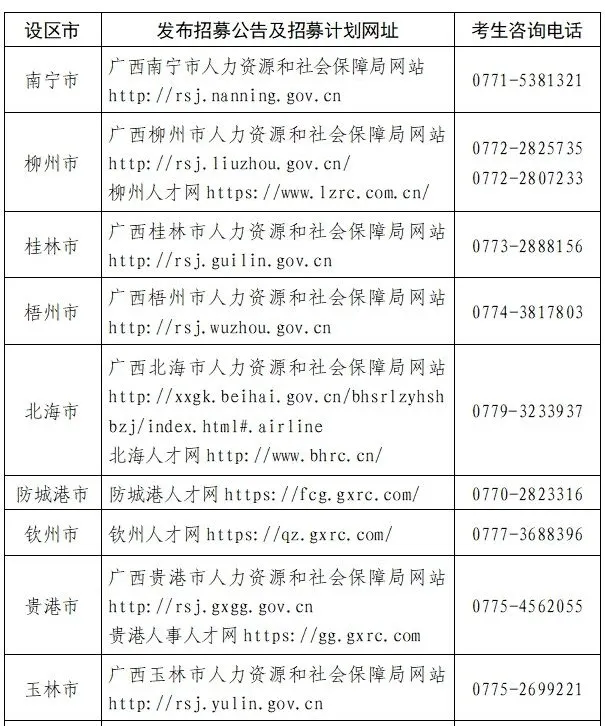 具體事宜可進入廣西“三支一扶”網(http://szyf.gxrc.com)查詢政策或向各市“三支一扶”辦公室電話咨詢。
