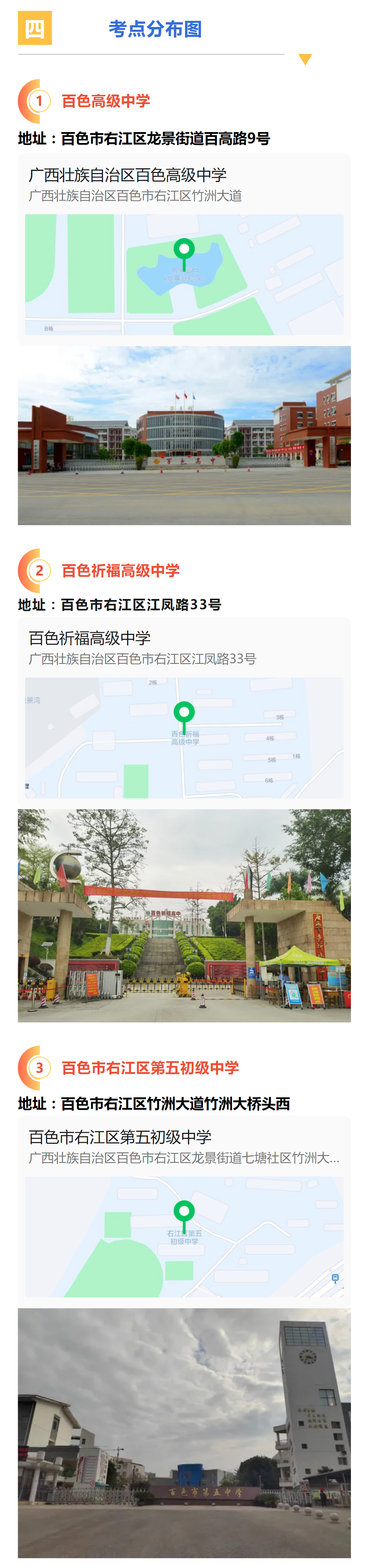 百色高級(jí)中學(xué)、百色祈福高級(jí)中學(xué)、百色市右江區(qū)第五初級(jí)中學(xué),考生具體考點(diǎn)以準(zhǔn)考證上地點(diǎn)為準(zhǔn)。