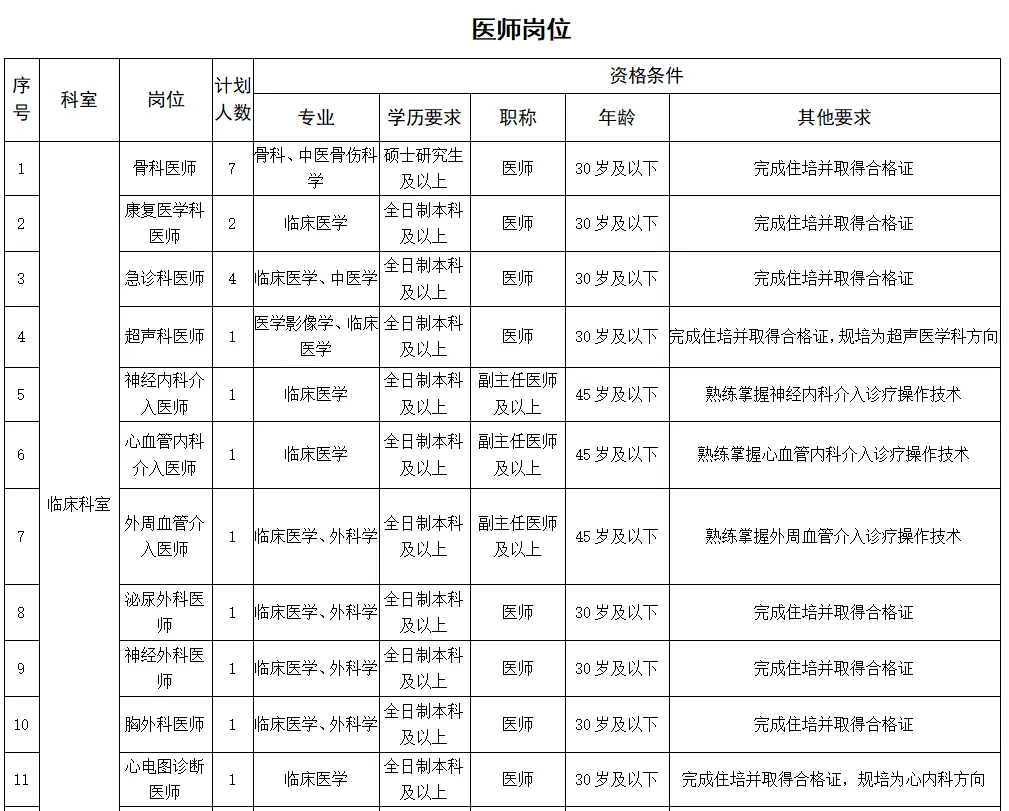 2.條件要求:具備碩士研究生及以上學(xué)歷(部分緊缺專業(yè)可放寬至本科學(xué)歷),年齡不超35歲;專業(yè)理論功底扎實(shí),業(yè)務(wù)技術(shù)過硬,有良好的團(tuán)隊(duì)合作精神;有二級(jí)甲等及以上醫(yī)院工作5年及以上經(jīng)歷,并有三級(jí)甲等醫(yī)院進(jìn)修6個(gè)月及以上經(jīng)歷。