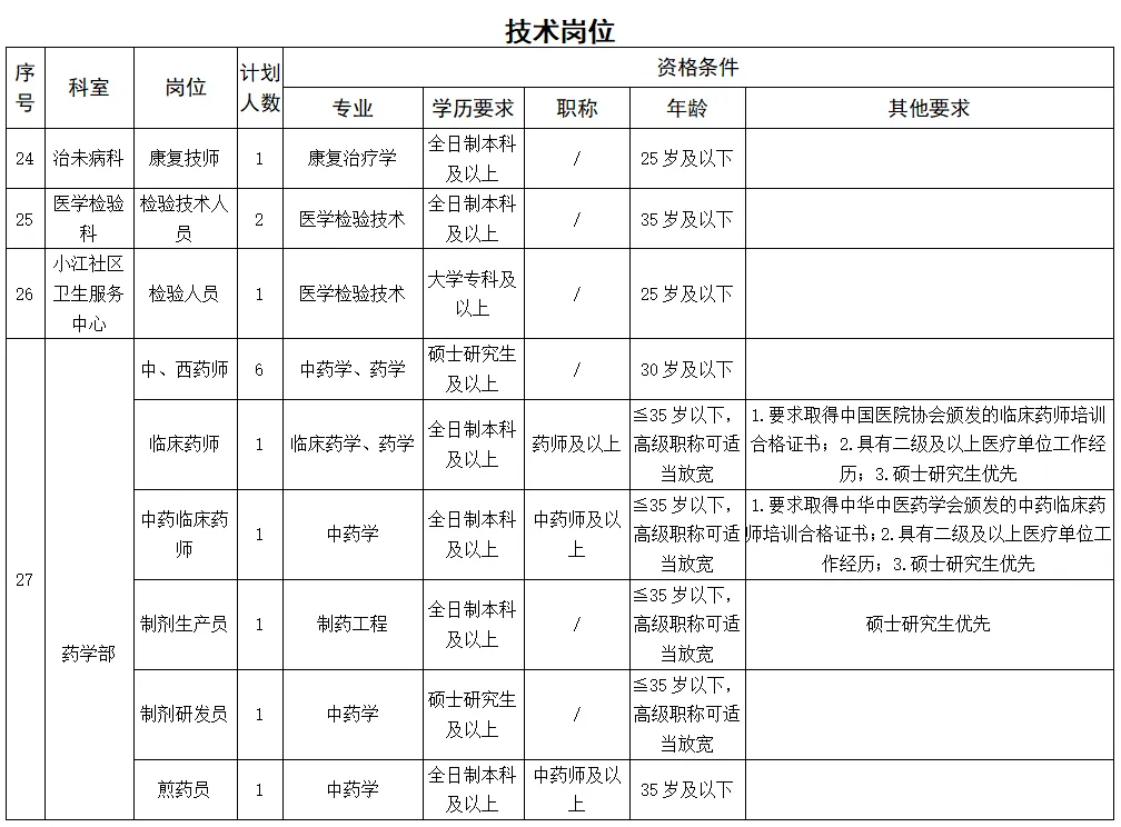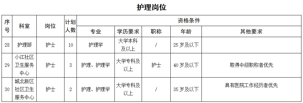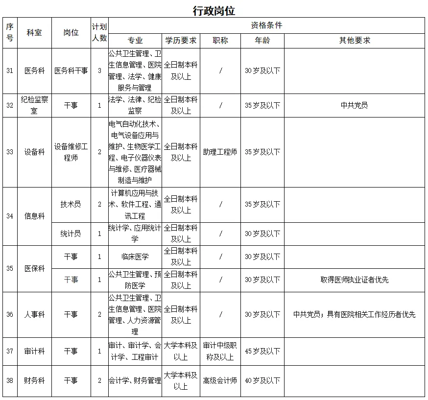 備注:醫(yī)學(xué)類碩士研究生及以上學(xué)歷、醫(yī)學(xué)類副高及以上職稱者不受招聘專業(yè)及名額限制。