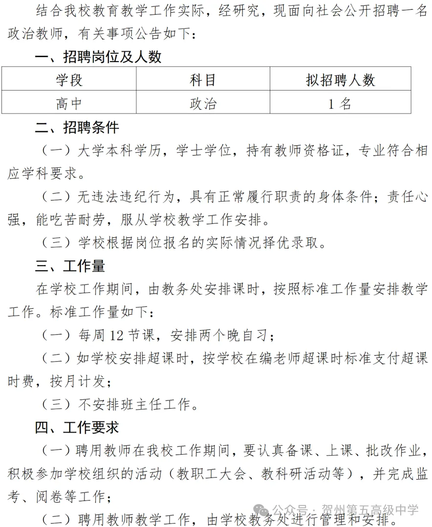 賀州第五高級(jí)中學(xué)2024年秋季學(xué)期招聘教師公告