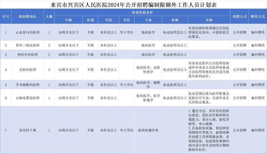 原文標(biāo)題:速看!來(lái)賓市興賓區(qū)人民醫(yī)院招聘編制限額外工作人員10名
