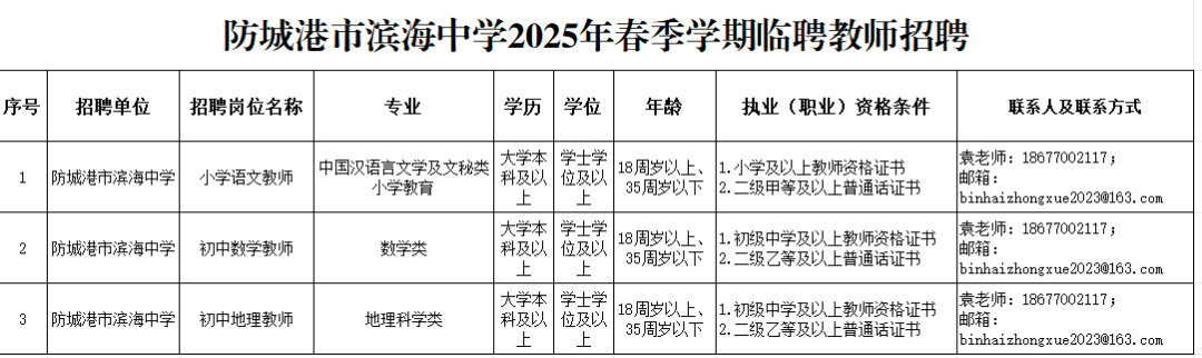 2025年防城港市濱海中學春季學期臨聘教師招聘公告
