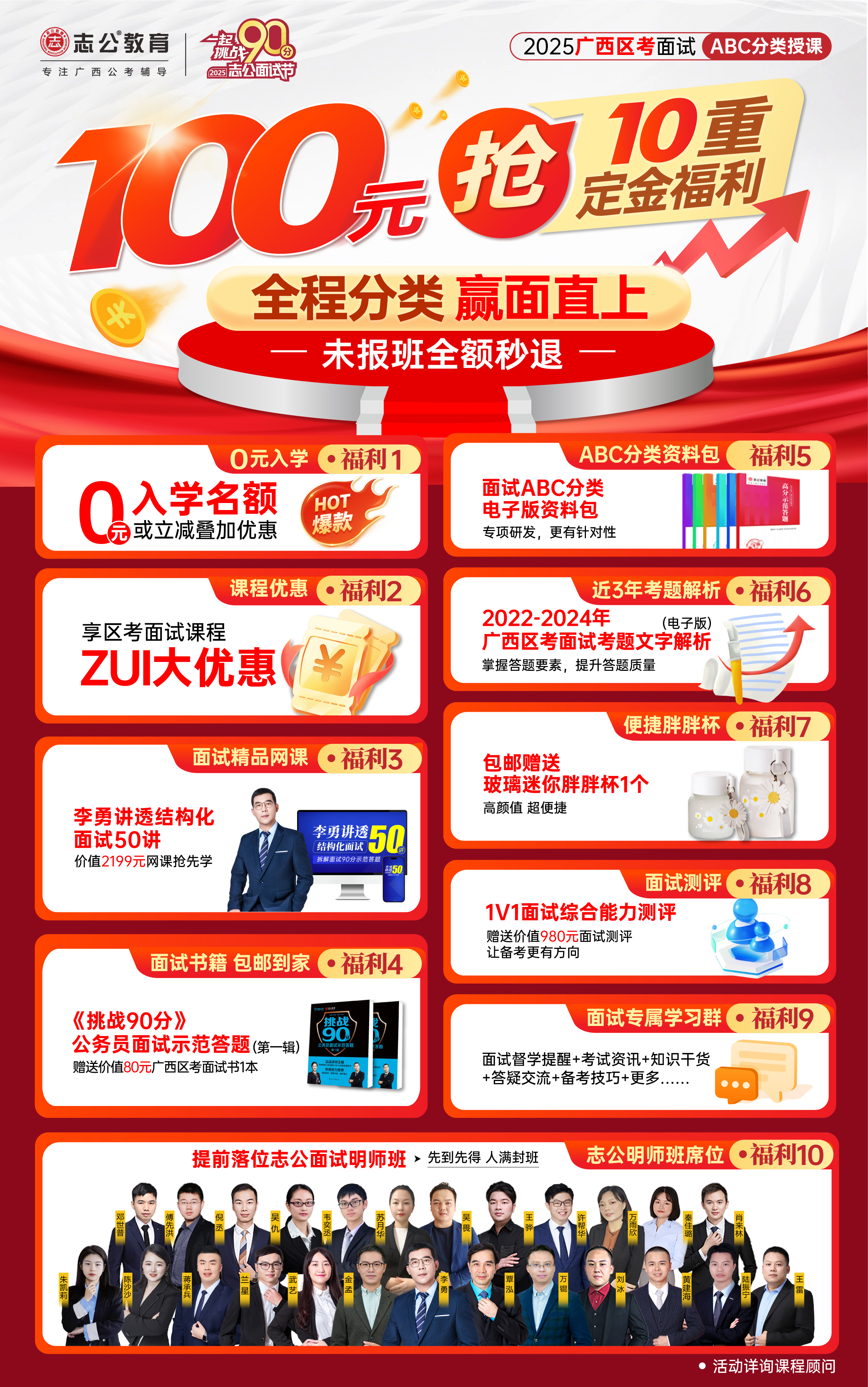 告訴大家個好消息!志公教育推出了2025年廣西區(qū)考面試ABC分類授課,現(xiàn)在只要100元就能搶到10重定金福利,聽起來是不是很誘人?