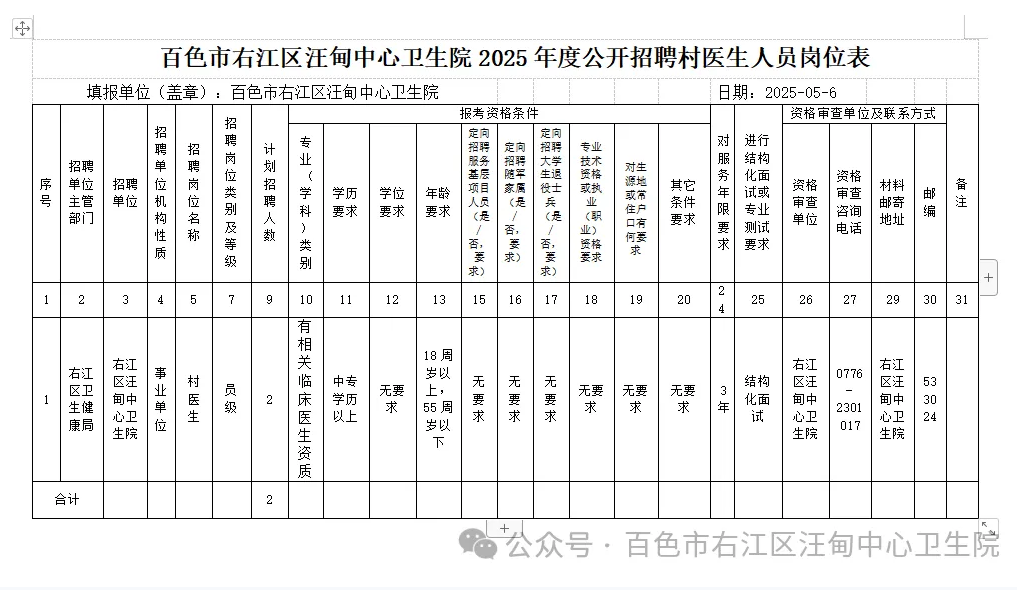 原文標(biāo)題:百色市右江區(qū)汪甸中心衛(wèi)生院2025年度公開招聘村醫(yī)生人員公告
