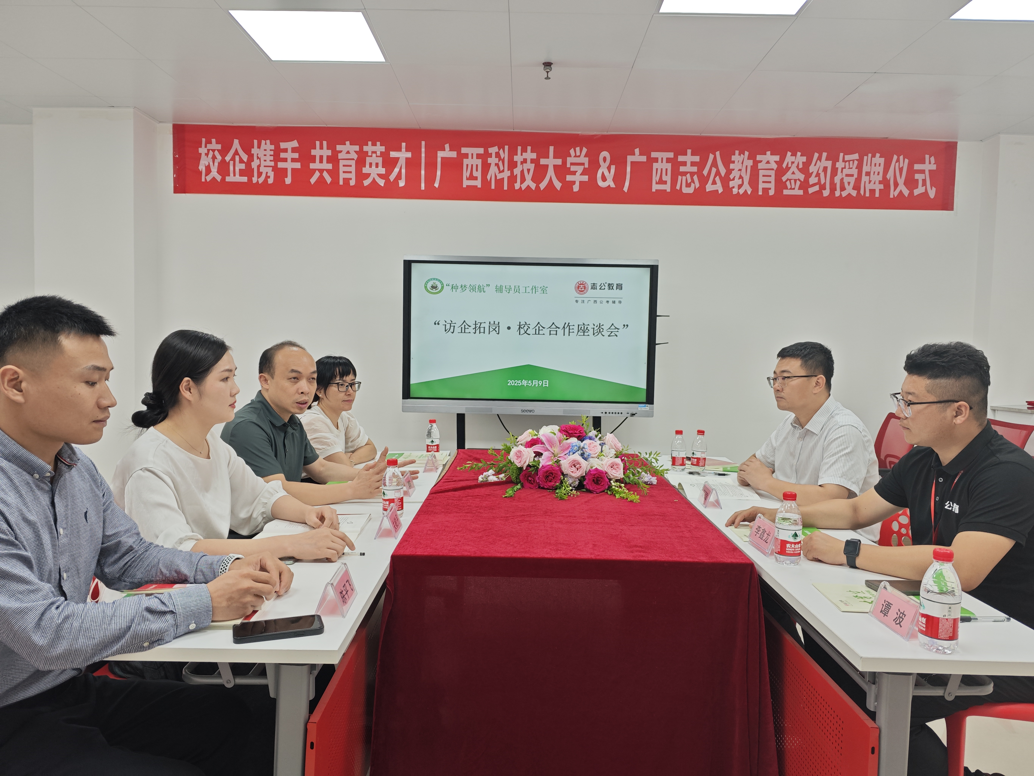2025年5月9日,志公教育柳州分校與廣西科技大學(xué)外國(guó)語(yǔ)學(xué)院在深入交流與友好協(xié)商的基礎(chǔ)上,于廣西科技大學(xué)成功舉行戰(zhàn)略合作簽約儀式。此次活動(dòng)由志公教育CBG總經(jīng)理吳冠敏先生帶隊(duì),廣西科技大學(xué)外國(guó)語(yǔ)學(xué)院黨委書(shū)記李輝、廣西科技大學(xué)"種夢(mèng)領(lǐng)航"工作室負(fù)責(zé)人張林微及師生代表共同參與,標(biāo)志著雙方在產(chǎn)教融合、人才培養(yǎng)及大學(xué)生就業(yè)創(chuàng)業(yè)領(lǐng)域的合作邁入新階段。
