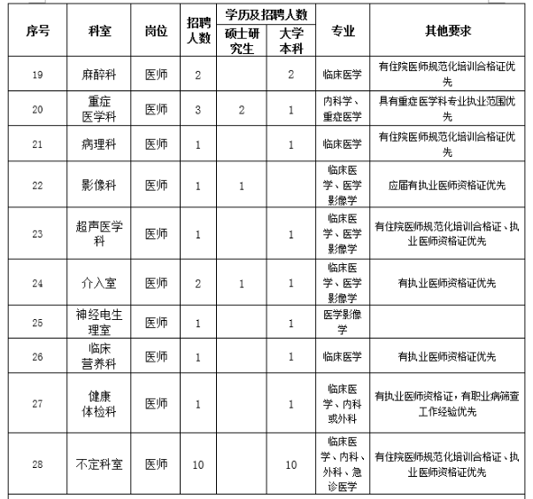 1.思想政治素質(zhì)好,擁護(hù)黨的路線、方針、政策。2.遵紀(jì)守法,醫(yī)德品行良好,有較強(qiáng)的事業(yè)心、責(zé)任心和進(jìn)取心。3.身體健康,能滿足應(yīng)聘崗位需要。4.具備相應(yīng)的學(xué)歷和學(xué)位,有履行應(yīng)聘崗位職責(zé)的專業(yè)能力、技能條件。5.具有團(tuán)隊(duì)精神,有良好的溝通能力。6.具備應(yīng)聘崗位所需要的其他條件。7.服從單位安排。