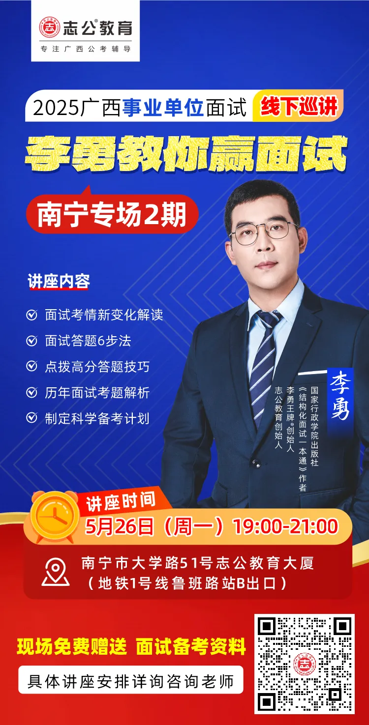 文章來(lái)源:李勇教你贏面試!2025廣西事業(yè)單位面試線下巡講南寧專場(chǎng)今天等你來(lái)!