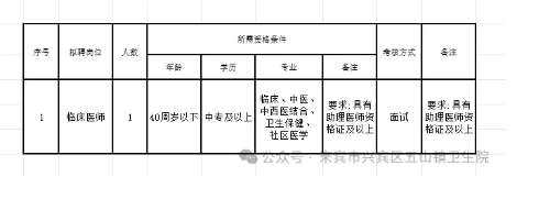 原文標題:來賓市興賓區(qū)五山鎮(zhèn)衛(wèi)生院公開招聘編制外聘用人員公告