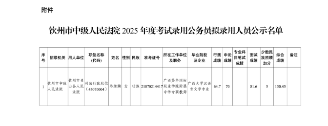 附件:欽州市中級人民法院2025年度考試錄用公務員擬錄用人員公示名單