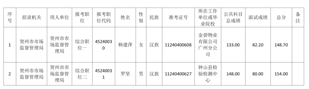 6.6 賀州市市場監(jiān)督管理局2025年度考試錄用公務員擬錄用人員名單