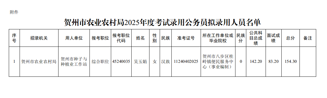 1 賀州市人力資源和社會保障局2025年公開遴選公務員擬任用人員名單