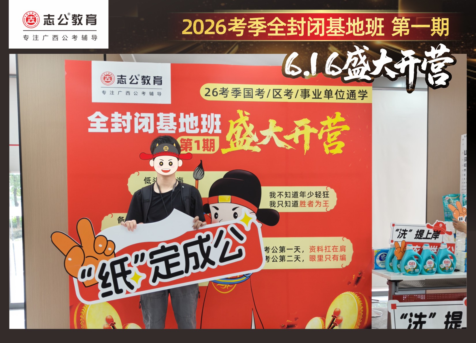 今天的開班還有一系列小活動(dòng)噢~瞧!——“學(xué)員打卡活動(dòng)”,所有今天到場的基地班學(xué)員,通過做一些小任務(wù)的方式,可以到前臺(tái)領(lǐng)取生活禮包即可領(lǐng)取生活禮品1份(一提六包的紙巾,或者一瓶洗衣液),這也是志公教育對(duì)所有學(xué)員的美好祝愿,預(yù)祝大家未來能夠“紙”定成公,“洗”提上/岸,“衣舉成公”!