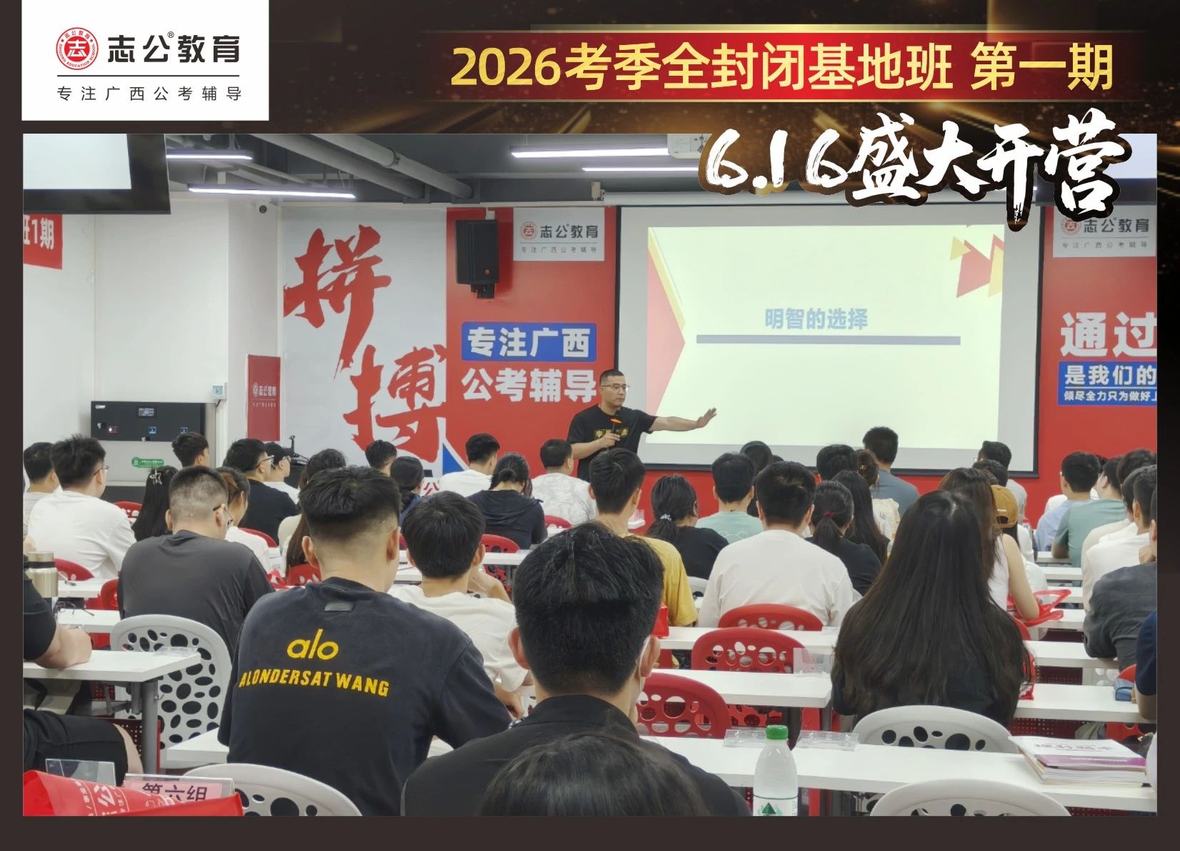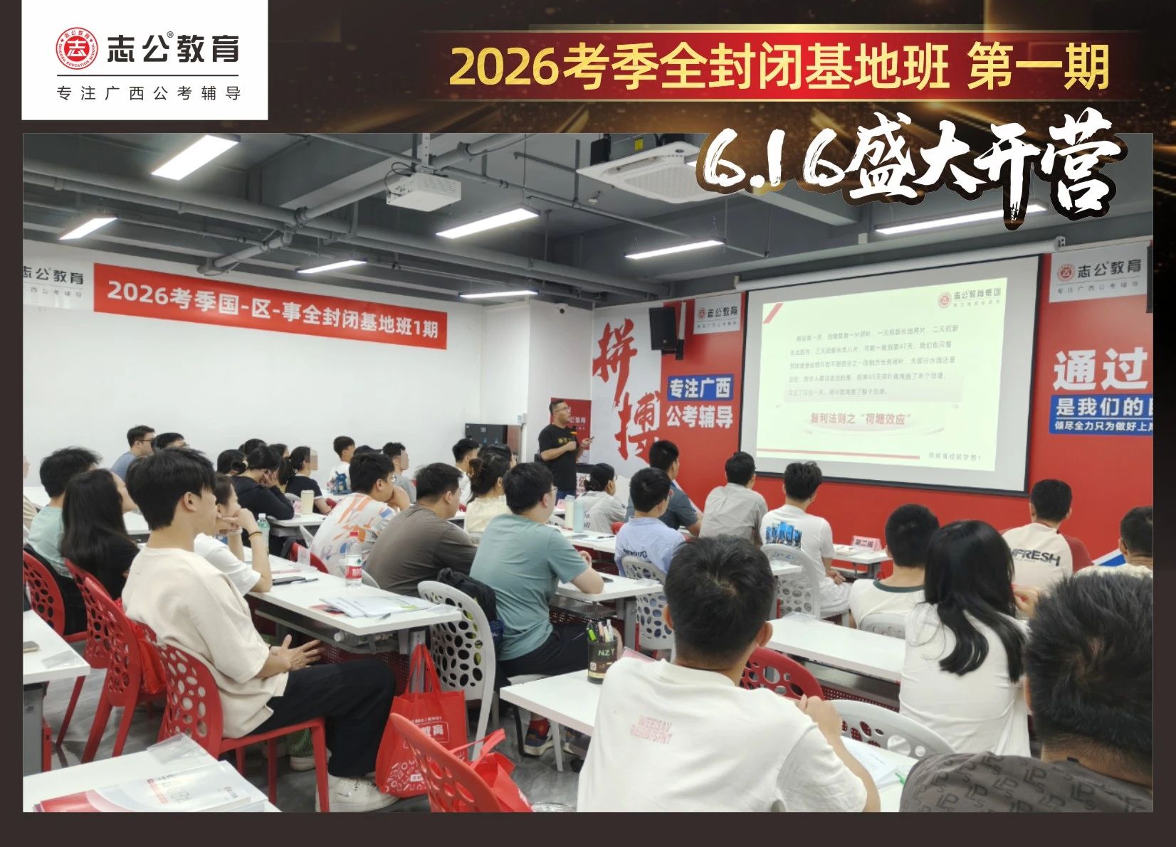 大家稍作休息之后,就是咱們期待已久的開班典禮啦!學(xué)員們?cè)诎嘀魅蔚囊龑?dǎo)下分組就坐。大家目光灼灼,熱情高漲,迫不及待想要開啟學(xué)習(xí)模式??催@座無虛席的盛況,志公26考季全封閉基地班第1期課程實(shí)力名不虛傳,各位學(xué)員用飽滿的熱情和積極的態(tài)度迎接此次課程的開展,期待大家能夠完成自己的蛻變和成長!