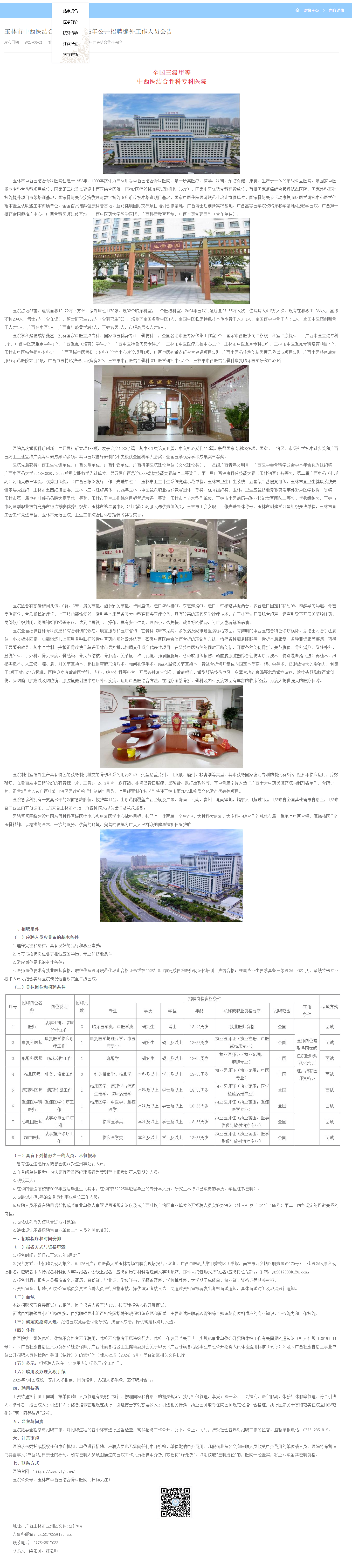 2025年玉林市中西醫(yī)結(jié)合骨科醫(yī)院招聘編外工作人員公告
