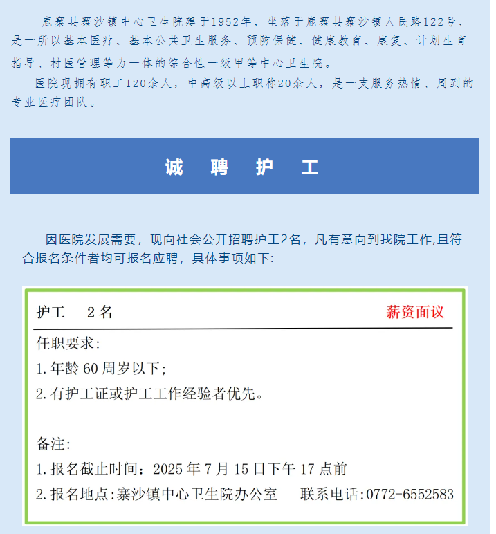 2025年鹿寨縣寨沙鎮(zhèn)中心衛(wèi)生院公開(kāi)招聘護(hù)工公告