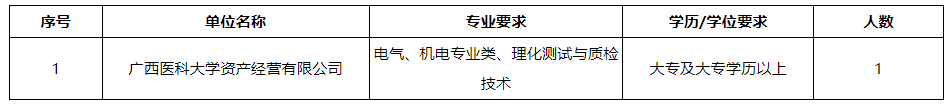 廣西醫(yī)科大學(xué)資產(chǎn)經(jīng)營(yíng)有限公司(以下簡(jiǎn)稱公司)是由廣西醫(yī)科大學(xué)于2011年8月3日獨(dú)資設(shè)立,經(jīng)營(yíng)管理廣西醫(yī)科大學(xué)經(jīng)營(yíng)性國有資產(chǎn)和對(duì)外投資的股權(quán)。公司依托學(xué)校和附屬醫(yī)院的資源優(yōu)勢(shì),圍繞醫(yī)藥、養(yǎng)老、醫(yī)學(xué)檢驗(yàn)、大健康項(xiàng)目等領(lǐng)域開展投資與合作,積極探索產(chǎn)學(xué)研協(xié)同發(fā)展。根據(jù)工作需要,現(xiàn)面向社會(huì)公開招聘工勤崗工作人員,具體招聘事宜如下: