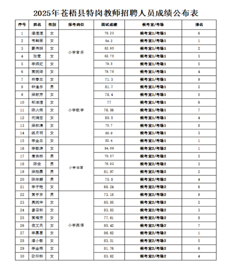 原文標(biāo)題:2025年蒼梧縣特崗教師招聘人員面試成績(jī)公布