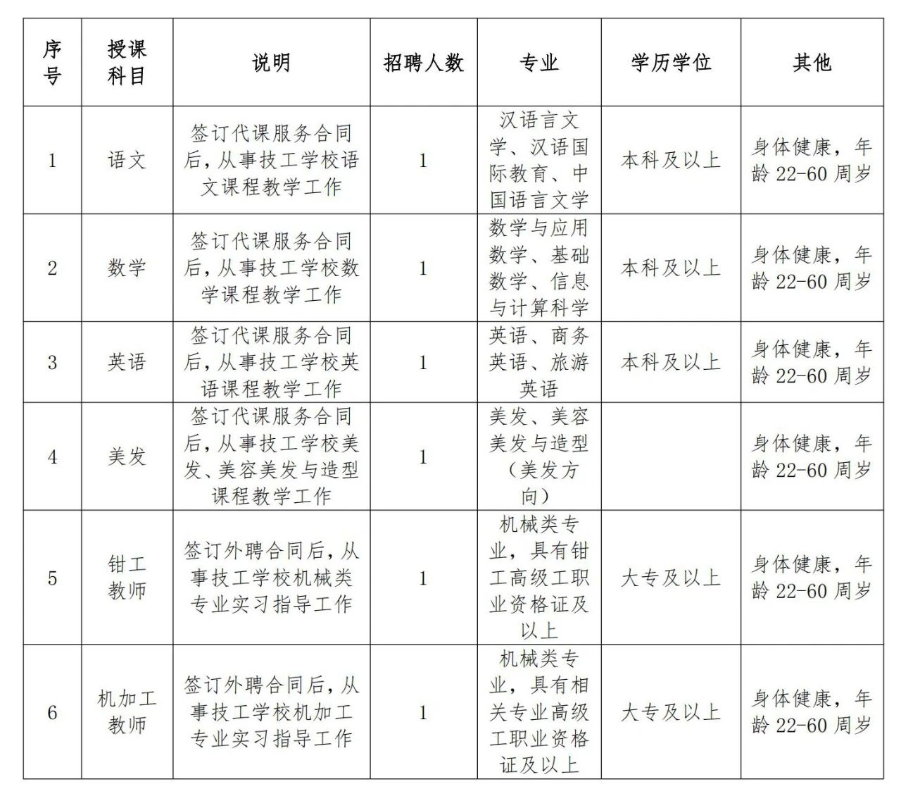 本次招聘代課教師4名,外聘教師2名,共6名,每人限報一個崗位,具體招聘崗位及條件如下: