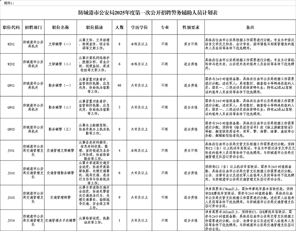 根據(jù)《廣西壯族自治區(qū)公安機關警務輔助人員條例》《廣西公安機關警務輔助人員招聘管理辦法(試行)》以及《防城港市公安機關警務輔助人員管理暫行辦法》等法律法規(guī)和文件規(guī)定,防城港市公安局決定2025年度第一次面向社會公開招聘警務輔助人員?,F(xiàn)將有關事項公告如下: