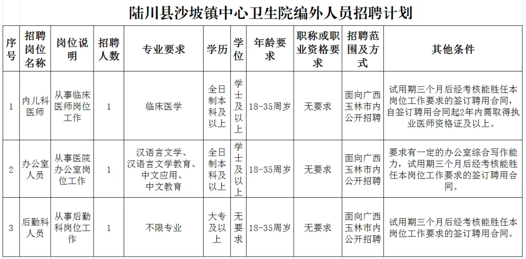 報(bào)名地點(diǎn):陸川縣沙坡鎮(zhèn)中心衛(wèi)生院公衛(wèi)樓五樓行政辦公室。(咨詢電話:7012189)。