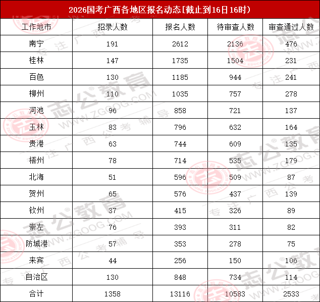 截止到16日16時,2026國考廣西地區(qū)各地市報名人數(shù)最多的地市為南寧、桂林、百色,其中南寧報名人數(shù)為2612人,位居第一!整體報考人數(shù)達13116人!對此,小志建議大家,報考崗位時需將自身職業(yè)愿景與個人實際條件(如專業(yè)、學歷、基層經(jīng)驗等)緊密結合,理性分析崗位競爭情況,最終做出最適合自己的選擇。