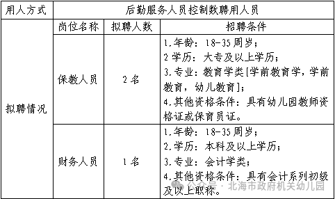 幼兒園與受聘人員簽訂勞動合同。簽訂勞動合同時約定試用期,試用期包括在勞動合同期限內。試用期滿考核合格的,予以聘用;不合格的,予以解聘。聘用期間享受我市機關事業(yè)單位后勤服務控制數人員的工資福利待遇。