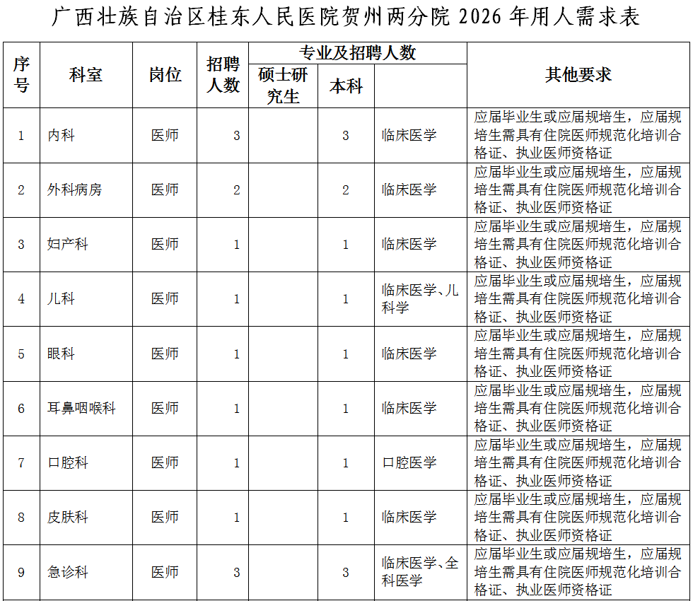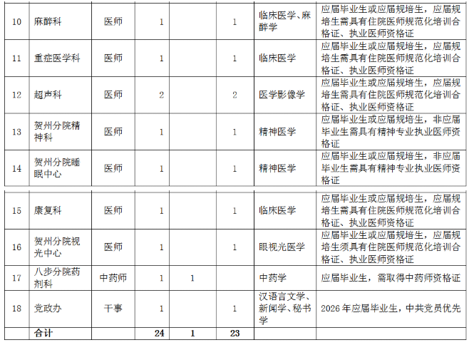 (應(yīng)聘報(bào)名二維碼)同時(shí),按以下要求提供個(gè)人應(yīng)聘材料(電子版)發(fā)電子郵箱:gdyy2817726@163.com(郵件主題請(qǐng)標(biāo)明:“姓名+賀州兩分院”字樣)。應(yīng)屆畢業(yè)生:個(gè)人簡(jiǎn)歷、身份證、就業(yè)推薦表、成績(jī)單、各種獎(jiǎng)項(xiàng)獎(jiǎng)勵(lì)證書(shū)、外語(yǔ)等級(jí)證書(shū)等。非應(yīng)屆畢業(yè)生:個(gè)人簡(jiǎn)歷、身份證、畢業(yè)證、畢業(yè)證備案登記表、學(xué)位證、學(xué)位證備案登記表、職稱證、執(zhí)業(yè)證、住院醫(yī)師規(guī)范化培訓(xùn)合格證、工作證明等。報(bào)名時(shí)所提交的申請(qǐng)材料必須真實(shí)、準(zhǔn)確,因報(bào)名時(shí)提交的申請(qǐng)材料不真實(shí)、不完整或錯(cuò)誤填寫(xiě)報(bào)名信息,造成資格審查、面試資格審查不通過(guò)的,后果由報(bào)名人員自行承擔(dān)。(2)資格審核。人事科依據(jù)招聘公告和用人需求規(guī)定的資格條件對(duì)應(yīng)聘人員簡(jiǎn)歷進(jìn)行收集和資格初步審查,經(jīng)招聘工作領(lǐng)導(dǎo)小組審核后,確定符合崗位條件報(bào)名人員名單,由醫(yī)院人事科電話或短信通知符合條件人員。(3)考核。考核筆試和面試由人事科負(fù)責(zé)組織實(shí)施,協(xié)助部門為醫(yī)務(wù)部、護(hù)理部、科教科以及用人科室,紀(jì)律監(jiān)督部門為監(jiān)察室。逾期未參加則視為自愿放棄。(4)試工。通過(guò)考核的非應(yīng)屆畢業(yè)應(yīng)聘人員,須到醫(yī)院試工5天。試工不通過(guò),不予聘用。(5)體檢。體檢工作由廣西壯族自治區(qū)桂東人民醫(yī)院按照有關(guān)規(guī)定統(tǒng)一組織。體檢標(biāo)準(zhǔn)參照《廣西壯族自治區(qū)事業(yè)單位公開(kāi)招聘人員體檢通用標(biāo)準(zhǔn)(試行)》《廣西壯族自治區(qū)事業(yè)單位公開(kāi)招聘人員體檢操作手冊(cè)(試行)》執(zhí)行。體檢不合格或隱瞞真實(shí)情況致使體檢結(jié)果失真的,不予聘用。因體檢不合格空缺崗位的,將按考核的綜合成績(jī),從高到低,順位補(bǔ)充體檢人員。(6)公示和聘用。對(duì)擬聘非應(yīng)屆畢業(yè)應(yīng)聘者在全院范圍內(nèi)進(jìn)行公示,公示期為5個(gè)工作日,公示期滿無(wú)異議按程序辦理聘用手續(xù)。對(duì)公示有異議,經(jīng)核實(shí)影響聘用的,取消其聘用資格;對(duì)反映問(wèn)題難以核實(shí)的暫緩聘用,待核實(shí)清楚后按有關(guān)規(guī)定辦理。