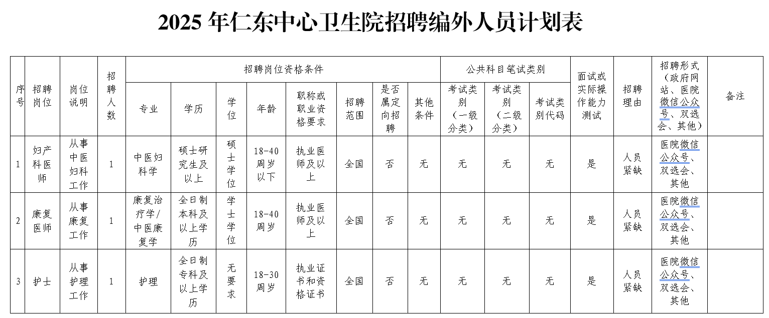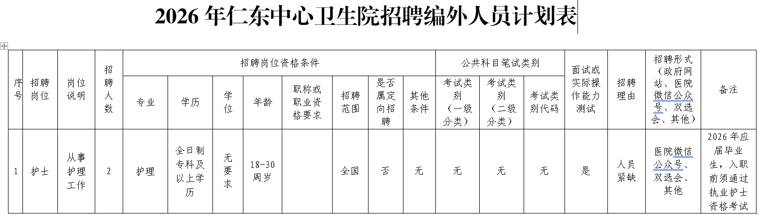 7.學(xué)歷、專(zhuān)業(yè)及其他任職要求詳見(jiàn)仁東中心衛(wèi)生院招聘編外人員計(jì)劃表。