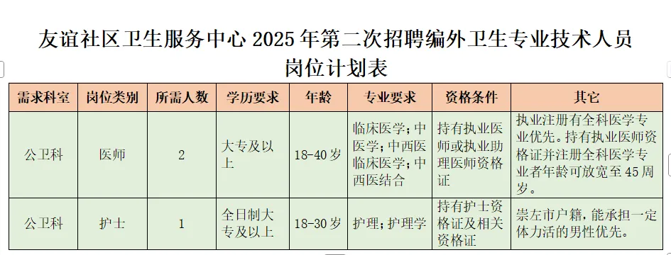 2025年崇左市江州區(qū)友誼社區(qū)衛(wèi)生服務中心公開招聘編外聘用衛(wèi)生專業(yè)技術人員公告