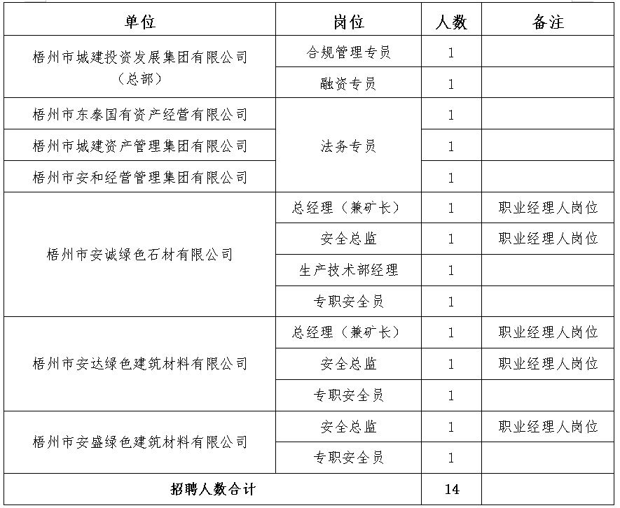 崗位要求詳見《梧州市城投集團(tuán)招聘計劃表》(附件1)。