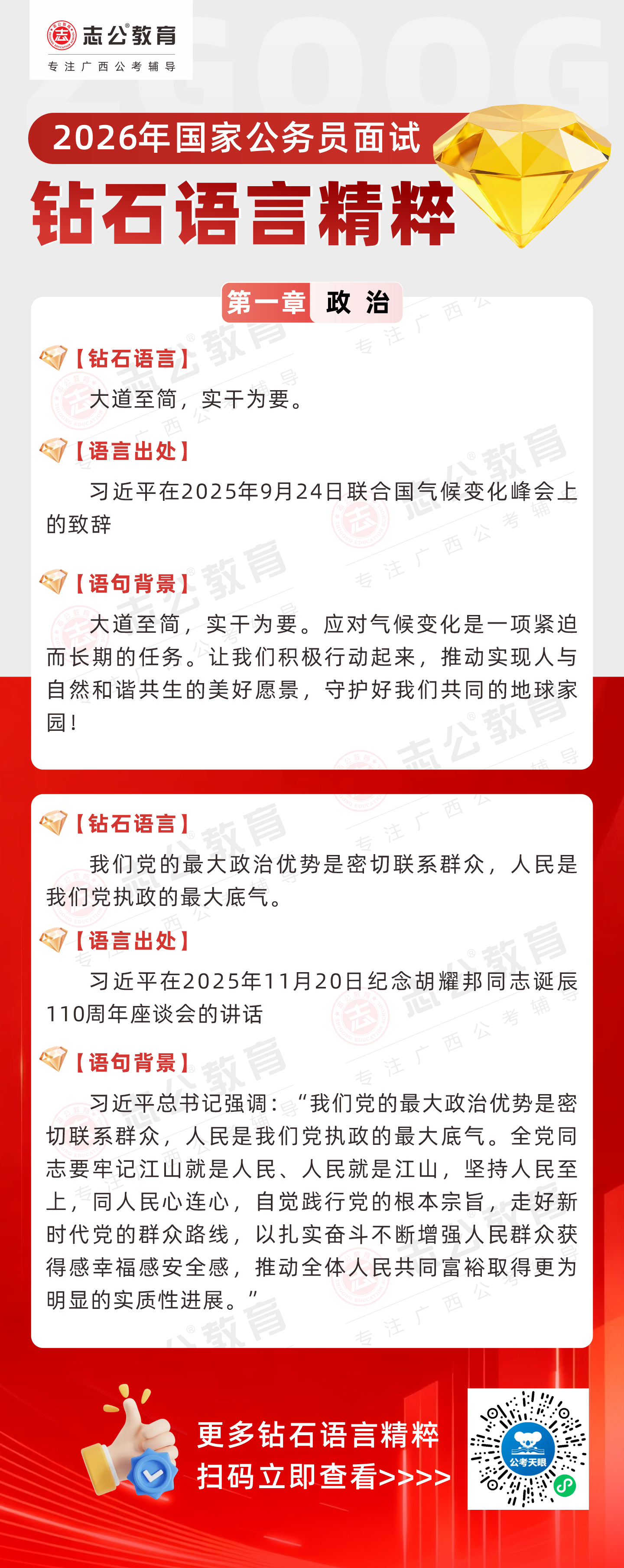 志公教育推出《2026國家公務員面試·鉆石語言精粹》政治篇!幫助考生把握政治類題目應答邏輯,提升語言表達層次,助你在面試中脫穎而出。備考2026國考面試,從掌握“鉆石語言”開始!