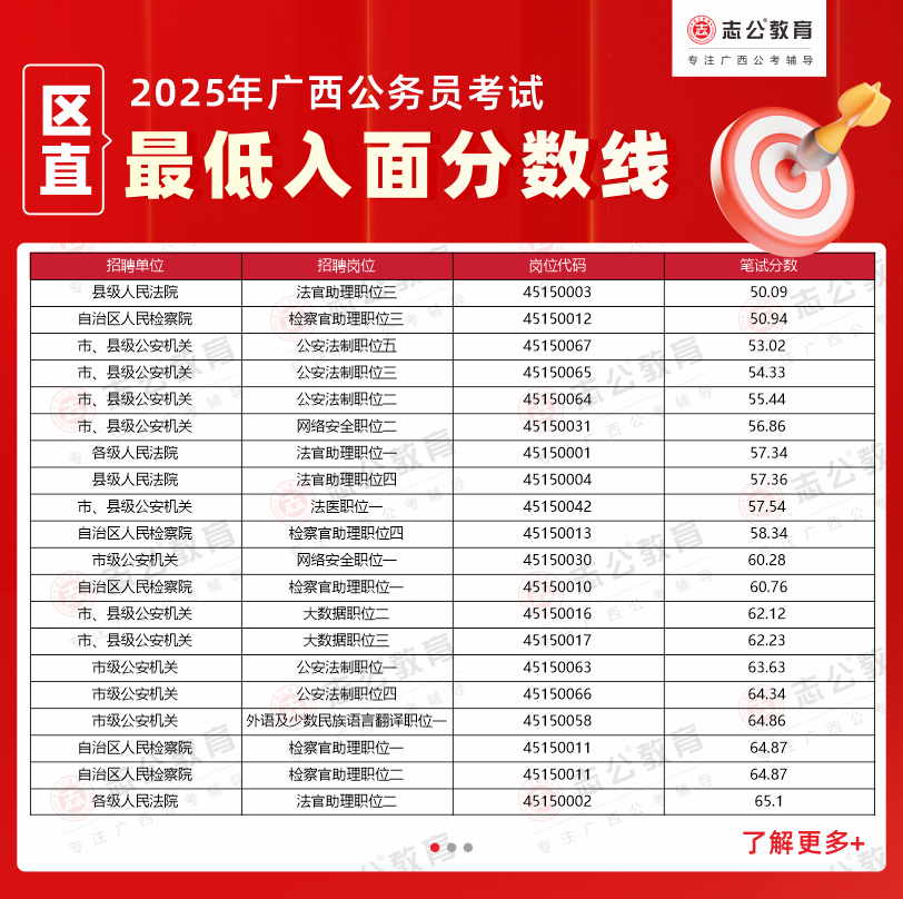溫馨提示: 以上數(shù)據(jù)均整理自官方發(fā)布的面試資格審查公告,僅供考生參考。2025年廣西公務(wù)員考試面試入圍名單及具體分?jǐn)?shù)線以廣西人事考試網(wǎng)及各招錄單位官方通知為準(zhǔn)。如需查詢更多2025廣西區(qū)考進(jìn)面分?jǐn)?shù)、不同系統(tǒng)的區(qū)直單位分?jǐn)?shù)線,或獲取完整的廣西公務(wù)員面試名單,歡迎持續(xù)關(guān)注志公教育的后續(xù)更新。我們將及時(shí)為您整理官方信息,助您全面了解考情,科學(xué)備考。